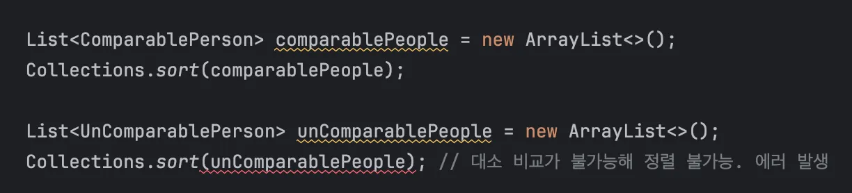 Comparable을 구현하지 않은 Person을 담은 리스트는 정렬이 불가능합니다.