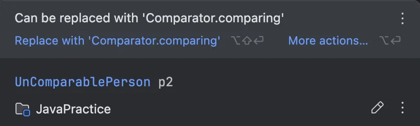 그런데 이렇게 코드를 작성하면 인텔리제이는 아래처럼 comparing 함수 사용을 추천합니다. 본인이 편한걸 쓰면 될 것 같습니다.