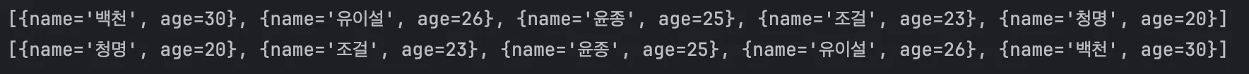 결과는 다음과 같습니다. 첫 줄은 이름 순으로, 둘째 줄은 나이 순으로 정렬되었습니다.