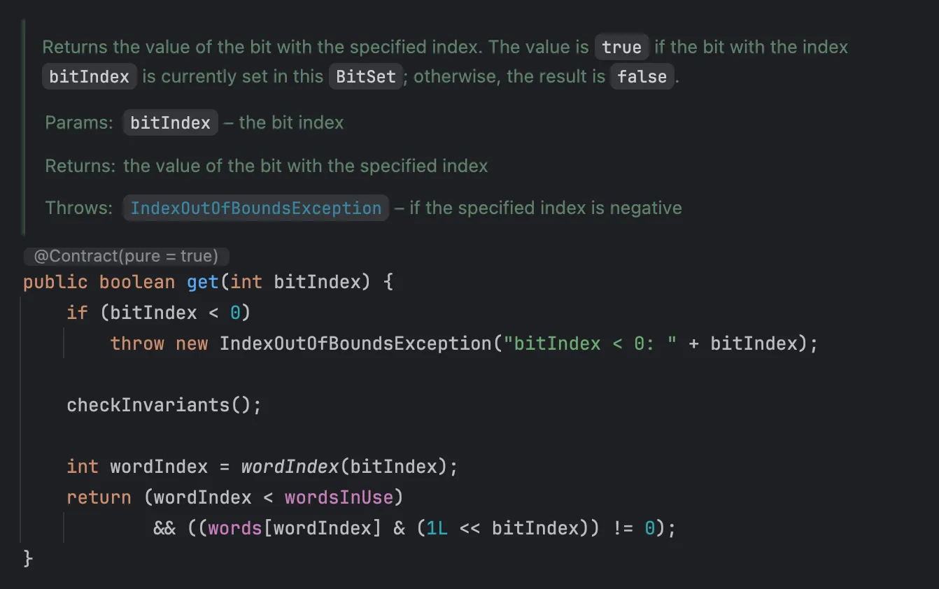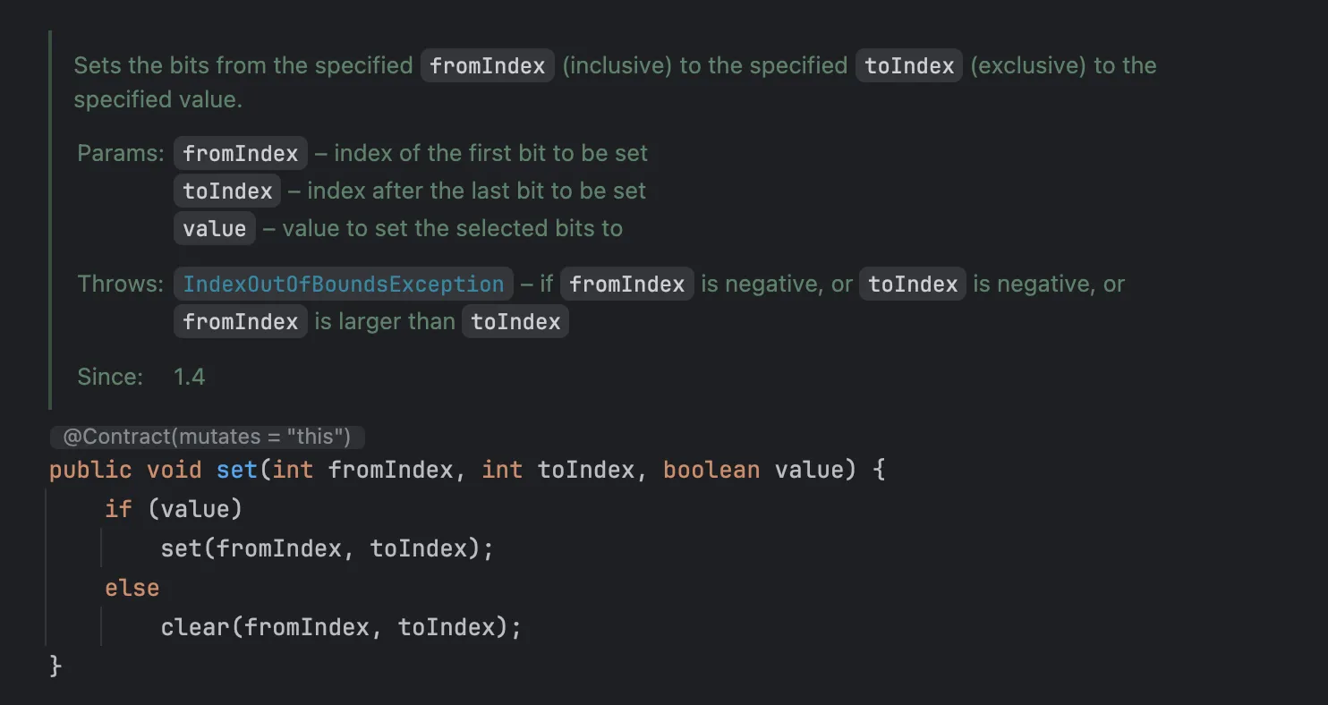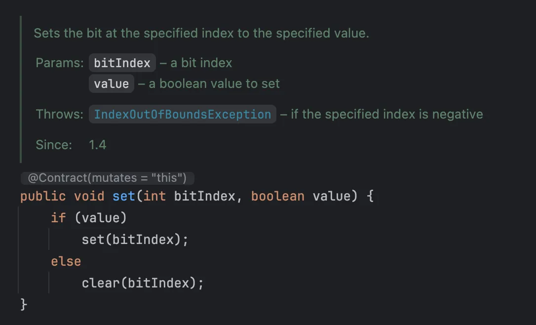 이외에도 비트를 0으로 변경하는 clear, 교집합 연산을 하는 and 등 다양한 연산자를 제공합니다.