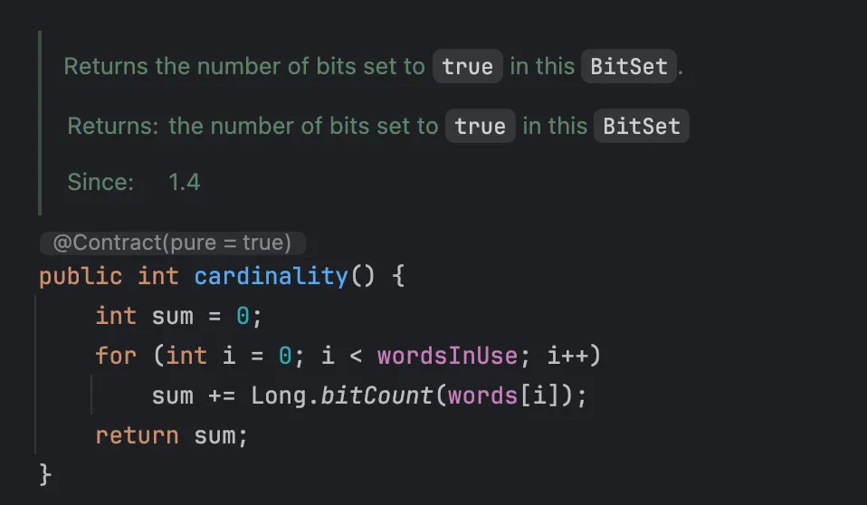값이 1인 비트의 수를 반환하는 cardinality() 함수는 다음과 같습니다.